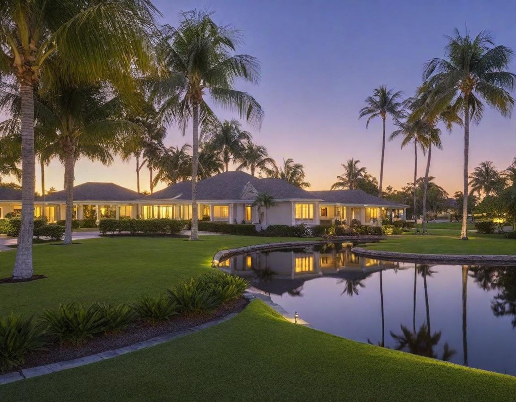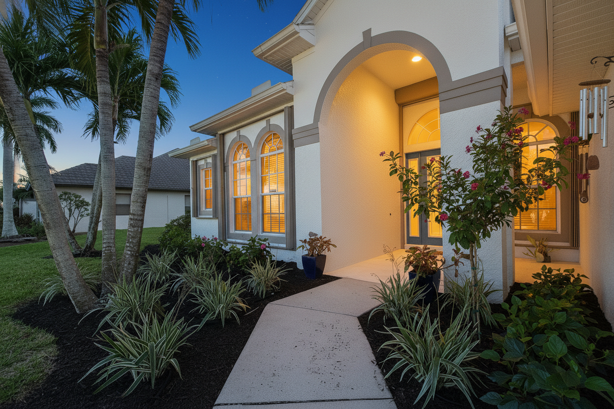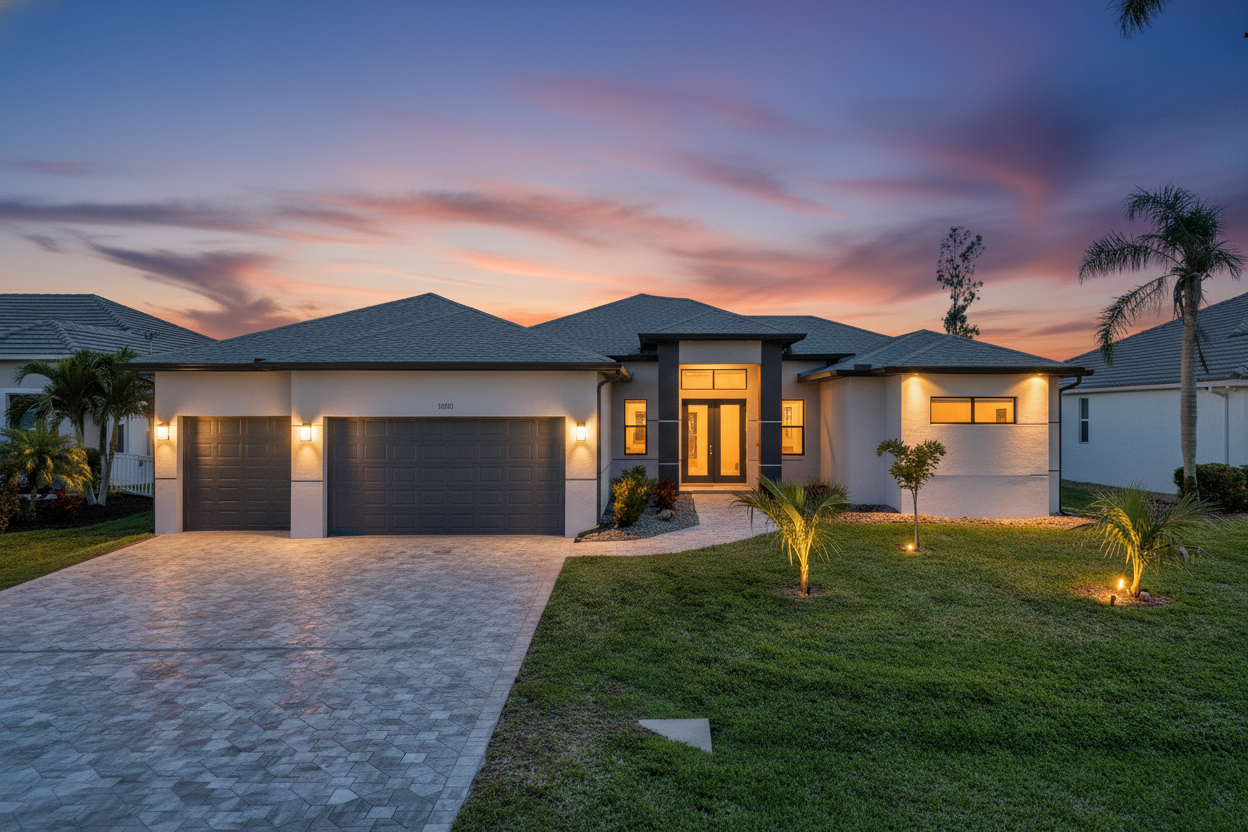 Rich sunset tones and balanced lighting highlight architecture, landscaping, and interior glow.